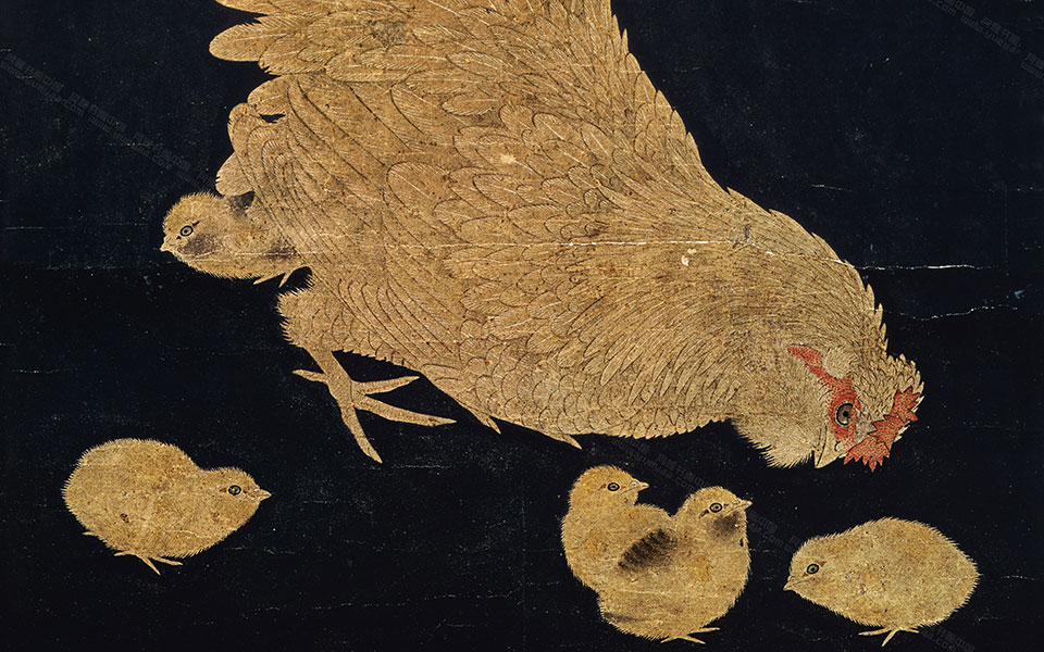 《子母鸡图》画一只母鸡,引领著五只孵出不久的小鸡,在地上漫步啄食。母鸡雪白的羽毛蓬松亮丽,目光充满著慈爱,小鸡则稚嫩怯弱,依偎在母亲的羽翼保护下。