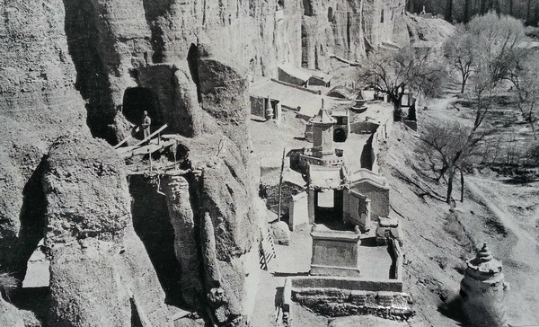 图:1943年的榆林窟(罗寄梅摄),图中人物为张大千先生
