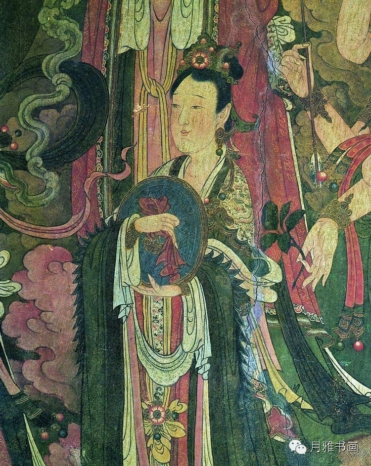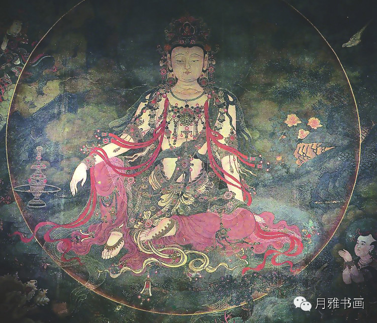 简介 : 《水月观音图》,面如满月,超然脱俗。屈右腿、盘左膝,坐于礁岩之上。宝冠项圈、璎珞花饰样样精制。一袭薄纱从肩头披下。透过放大镜观看披纱的图案是六菱花瓣,每一花瓣竟然